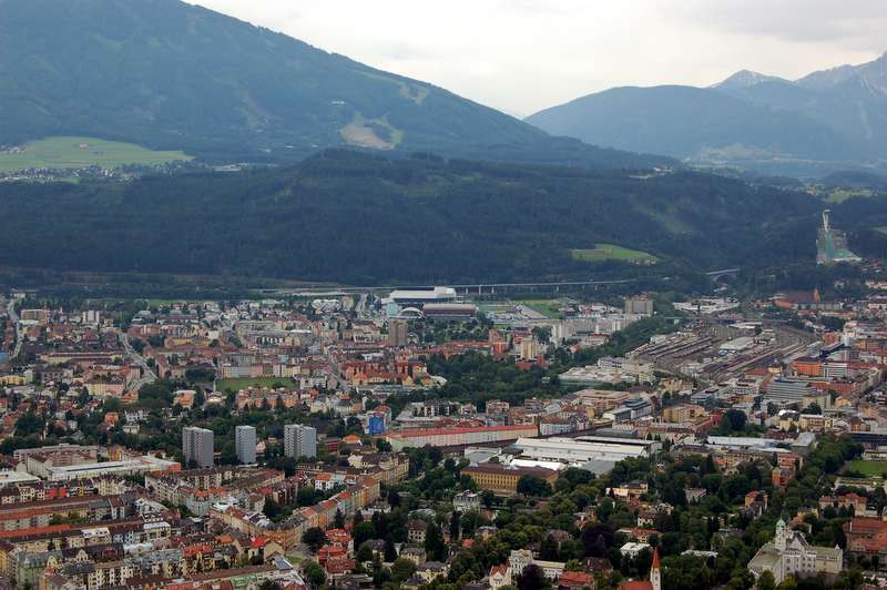 Flott utsikt over byen Innsbruck. Berg Isl bakken til høyre, mens Tivoli Neu stadion ligger midt på bildet.