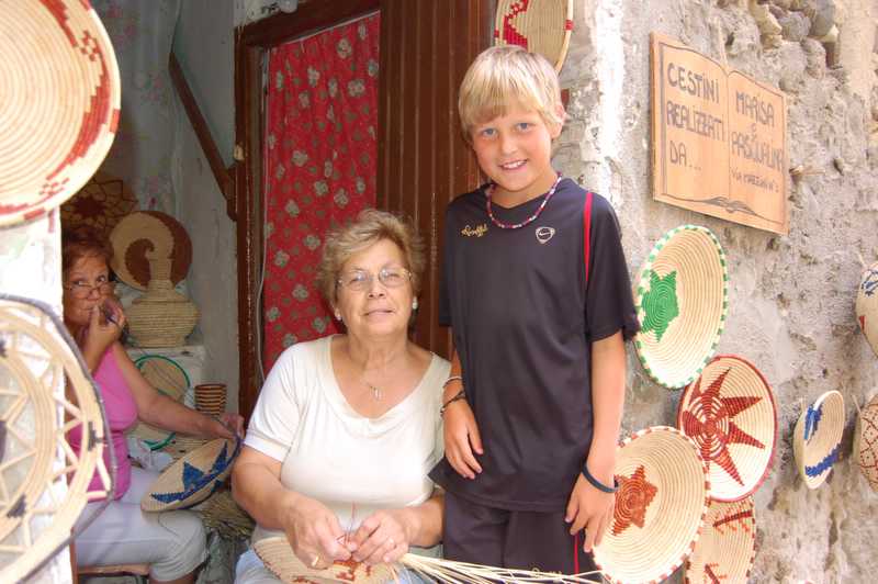 Sindre og 2 “flettedamer. Her kjøpte vi en flettekurv ala den øverst til venstre for Sindre til 20 euro.