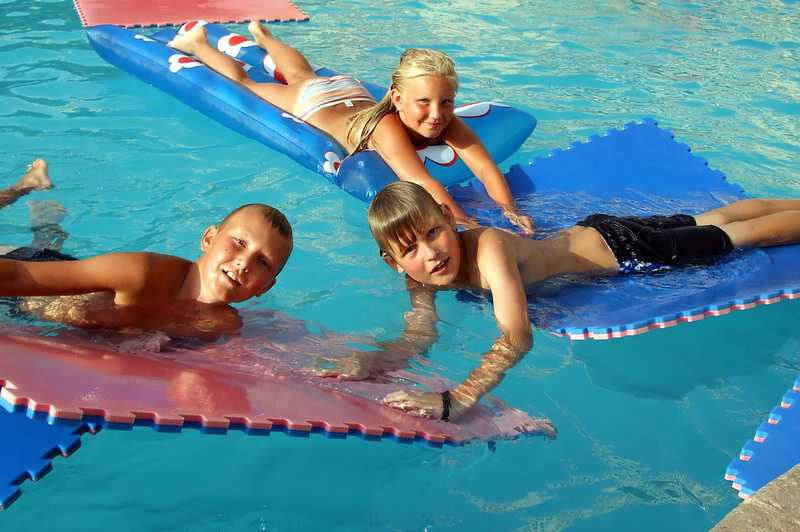 Aslak, Lovise og Sindre i en badestund i bassenget på hotellet.